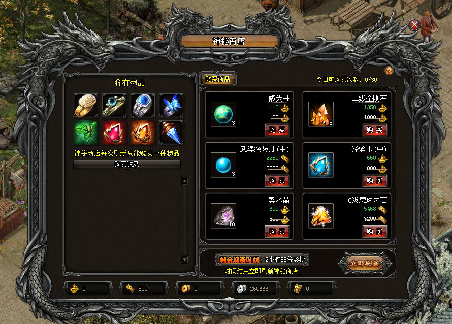 活动方式:活动期间,神秘商店中将以低价出售各种商品,每次货架上将出现6件货品,货品种类定时刷新,或者可使用元宝立即刷新,每次刷新后只可在6种商品选择其中一件购买。每天最多可购买30次