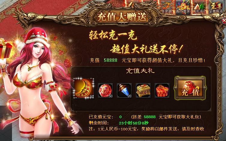 活动方式:活动期间累计充值达58888元宝,即可获得超值大礼,且冲且珍惜。
