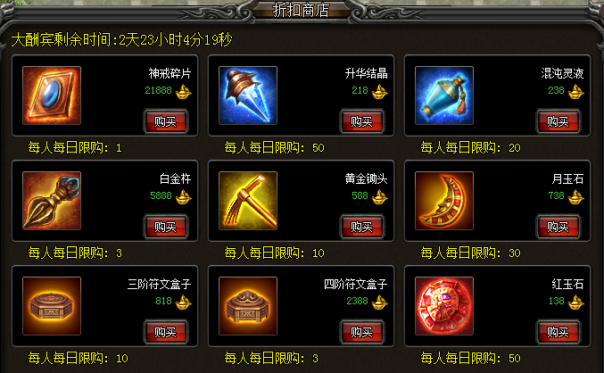 活动详情:活动期间折扣商店全场低折出售,每种商品售完即止。每位玩家限购一定数量的商品。部分商品要求满足一定等级才能购买。物美价廉,不要错过哦!