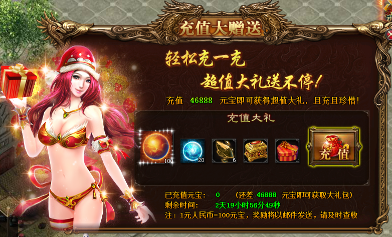 轻松冲一冲,超值大礼送不停,只要在活动期间累计充值达到46888元宝,即可领取“喜大普奔”坐骑提升豪礼一份!