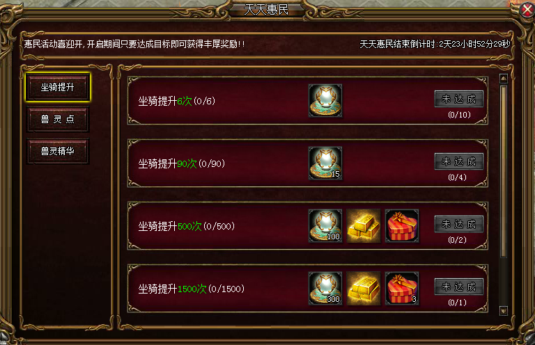 活动详情:天天惠民开启期间,只要玩家达成相应目标即可获得对应奖励。活动类型将会有4大类,灵石类,衣橱类,武魂炼体类,坐骑类。每次只开启一个类型活动。