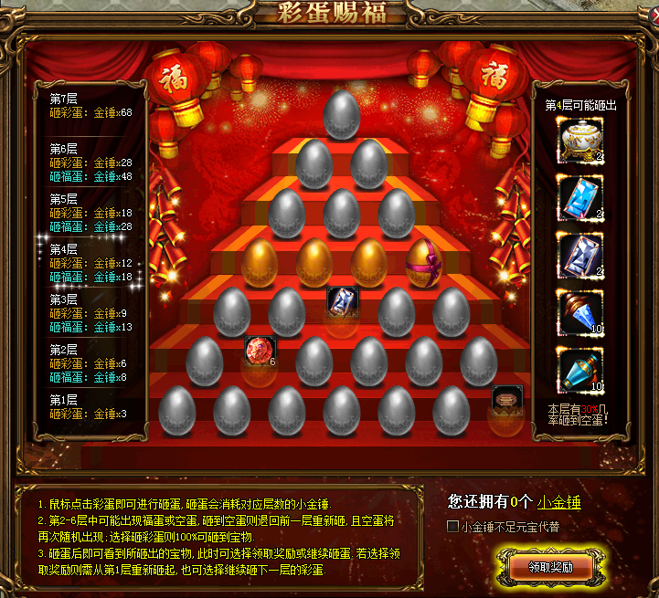 3、当砸出至少一个奖励后即可领奖,领奖后可重新砸蛋,奖励会随着层数的提高变的更珍贵。