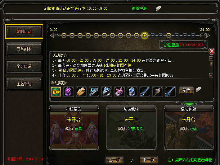 3、新增定时活动:遗忘神殿,通过土城NPC天境遗子进入该活动。该活动每天开放3次,分别为上午10:00--12:00,下午15:00--17:00,晚上22:00--24:00。每次进入该活动需要消耗1张神秘地图卷轴。