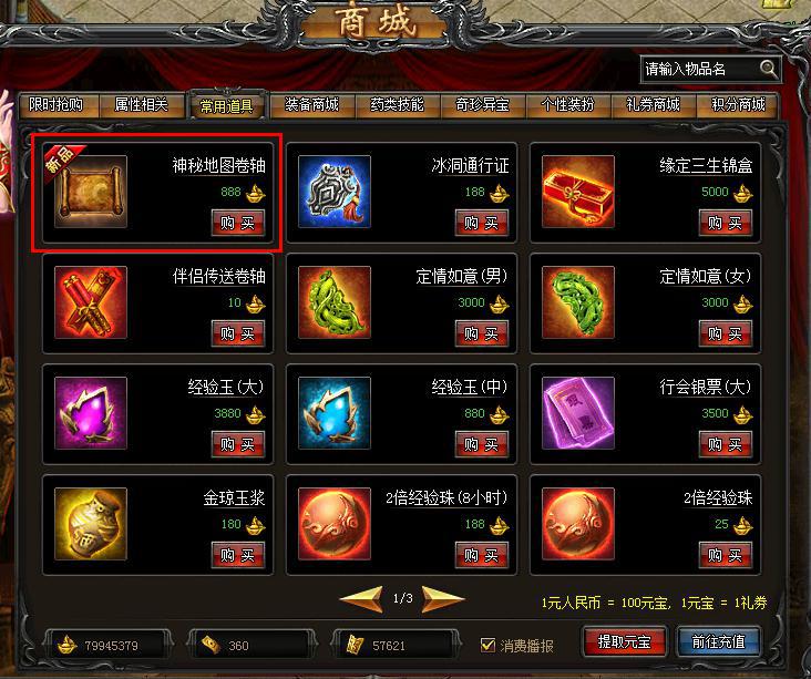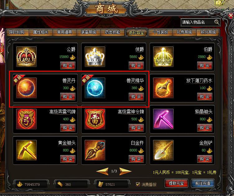 2、商城奇珍异宝分页新增道具:兽灵丹、兽灵精华;常用分页新增道具:神秘地图卷轴;