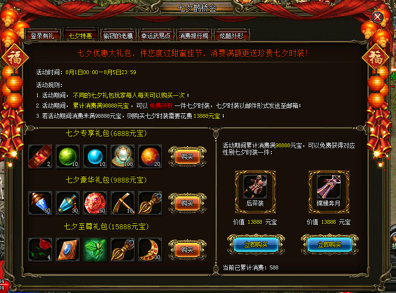3.若活动期间消费未满98888,则购买七夕时装需要花费13888元宝;