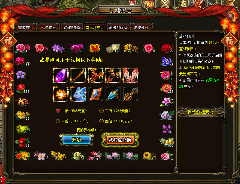 2.消耗对应的元宝可开启相应倍数的武易点转盘;