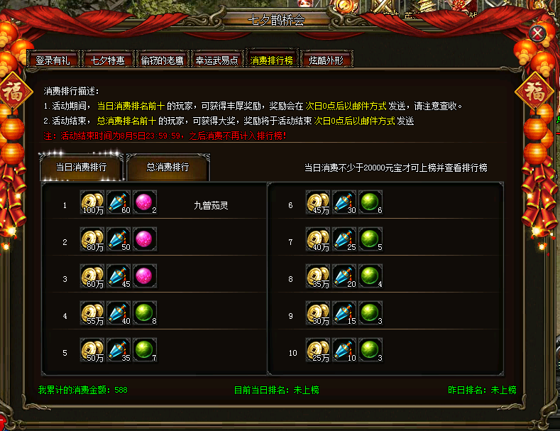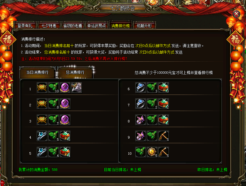 1.活动期间,当日消费排名前十的玩家,可获得丰厚奖励,奖励会在次日0点后以邮件方式发送,请注意查收。
