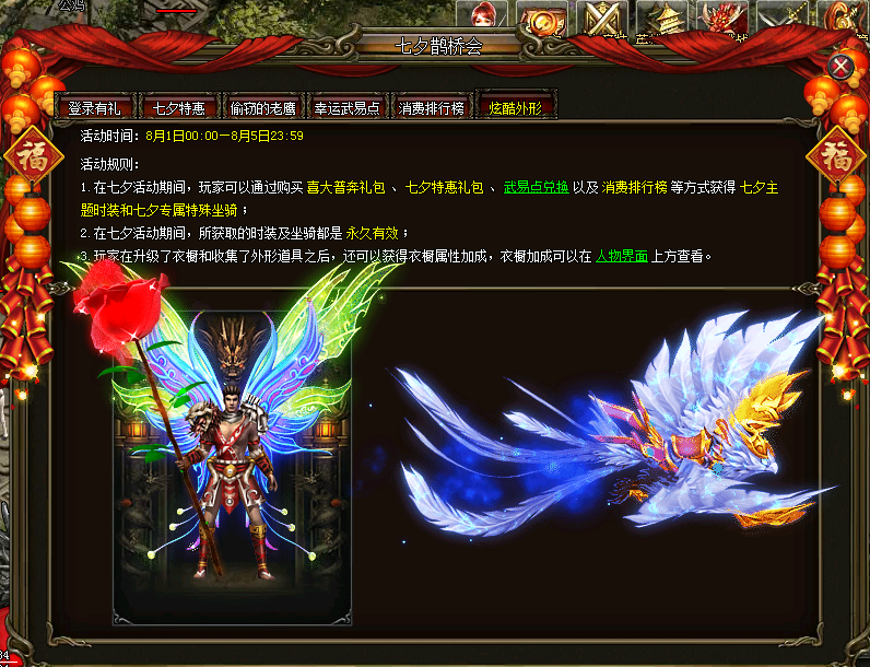 2.活动期间,累计消费满98888元宝,可以免费领取一件七夕时装,七夕时装以邮件形式发送至邮箱;