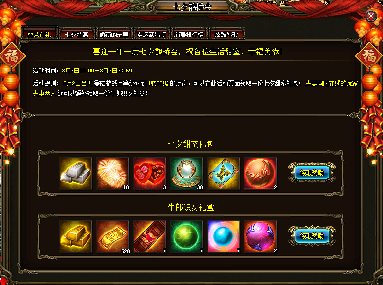 活动当天,满足1转65级的玩家登录游戏,可以免费领取一份七夕甜蜜礼包,已结婚的玩家夫妻两人同时在线,还可以额外领取一份牛郎织女礼盒;