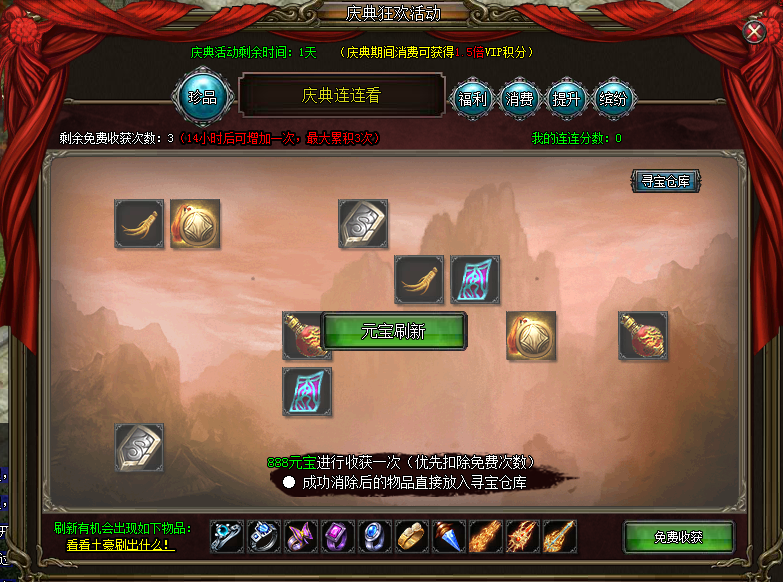 活动时间:想要高级珍品装备和特殊物品吗?动起你的手指,进行庆典连连看消除小游戏,消除到的物品就属于你!