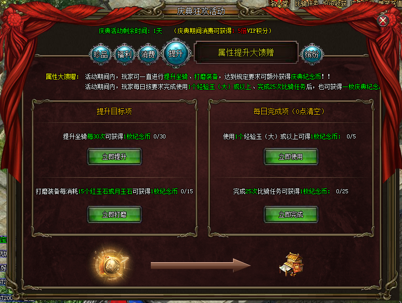 参与方法:活动时间,只有根据要求提升自身属性,则可以获得纪念币!纪念币可兑换庆典特有物品哦!