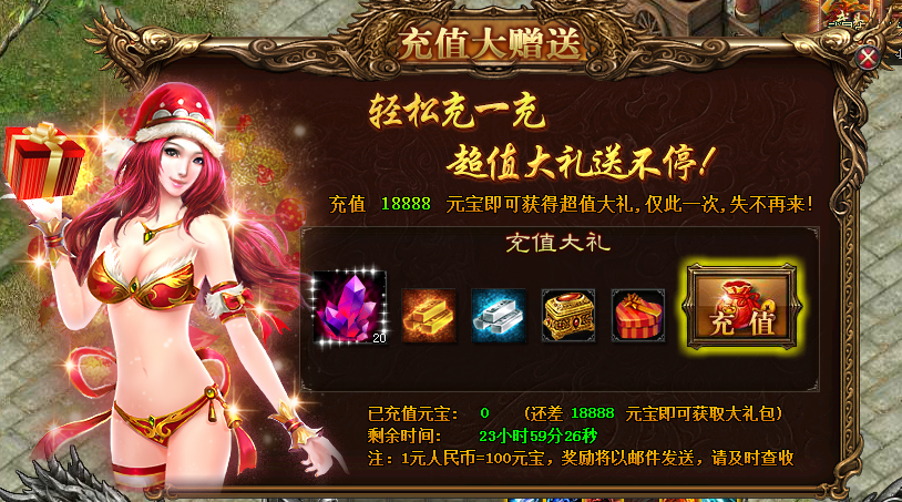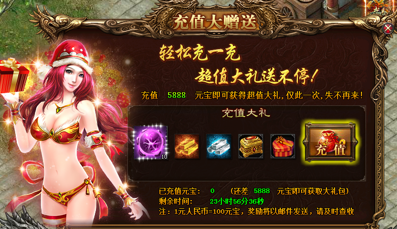 3888元宝领取:绑定金币*300000,坐骑提升丹*10,升华结晶*10,强效修为丹*5,武魂经验单(小)*2,混沌灵液*5,经验玉(大)*1.