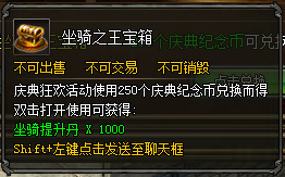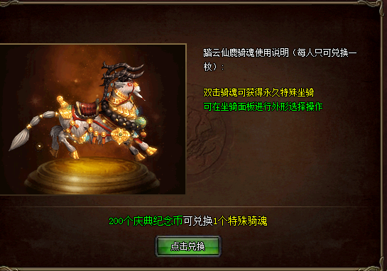 活动介绍: 活动期间内,玩家可一直进行提升坐骑、打磨装备,可获得“庆典纪念币”,每日完成使用1次经验玉(大)、完成25次比骑任务后,也可获得一枚“庆典纪念币”。