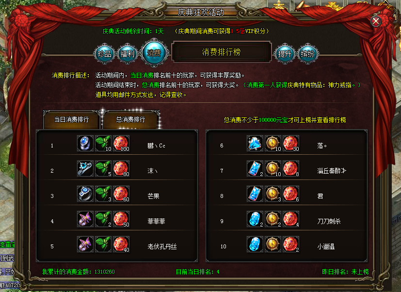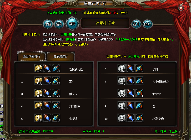 参与方法:活动时间,玩家达到指定的消费金额后,可获得系统送出的珍稀物品!可实时在面板查看到排名!