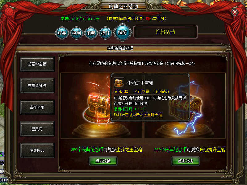 活动介绍:狂欢庆典活动期间,玩家可以收集庆典纪念币,然后在面板进行兑换!有坐骑之王宝箱、顶级提升宝箱,变身卡,和兽灵丹只有在活动期间才有哦!同时,如果本服玩家的连连分数到达一定值后,则可以召唤出吉祥物,每天晚上10点在比骑城出现,为大家送上祝福!