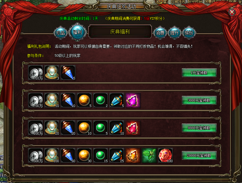 28888元宝领取:绑定金币*5000000,坐骑提升丹*100,升华结晶*50,强效修为丹*30,武魂经验单(小)*15,混沌灵液*25,经验玉(极)*1,