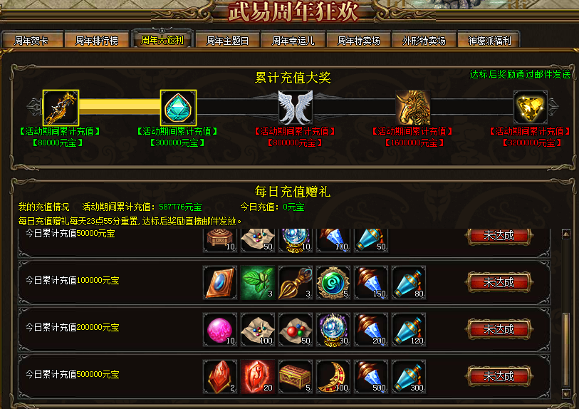 当日累计充值500000元宝:极品武易装备碎片*2、武易结晶*20、5阶符文自选礼包*5、月玉石*100、升华结晶*500、混沌灵液*300