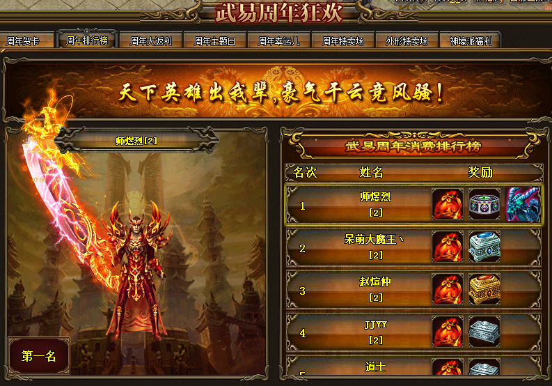 天下英雄我辈出,豪气干云竞风骚!武易一周年,那些神豪都在哪呢,现在就来冲榜,成为九五至尊吧!