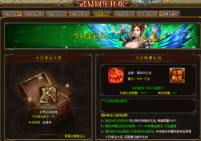 活动详情:活动期间每日限量100个特惠礼包,购买特惠礼包可以获得一个1-100的幸运数字,不会重复。每日21点抽出1个该日中奖数字,中奖数字所属玩家将会获得今日幸运大奖。买的越多,中奖几率越大哦!