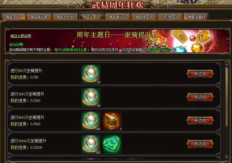 活动详情:活动期间每日有不同的主题,每天0点更换当日主题,每日达成对应条件,对应奖励即会通过邮件发放。