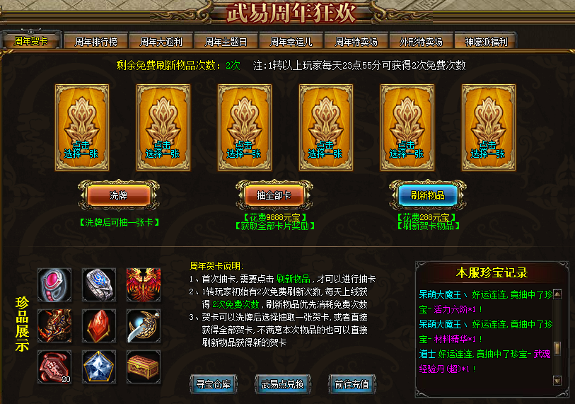 抽周年贺卡,拿幸运奖品,极品装备、坐骑、翅膀等你带走,快来试试手气吧!