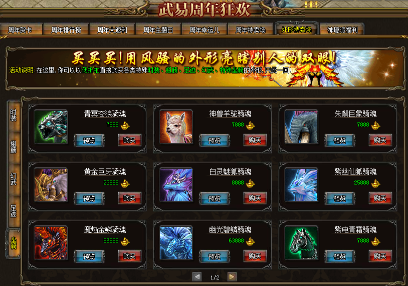 周年盛大节日,各种靓装外形特卖,平日省吃俭用,此时怎能不购置一套新装扮,聊以自慰!武易·霸王印,神兽羊驼骑魂,各种风骚外形,亮瞎别人双眼!