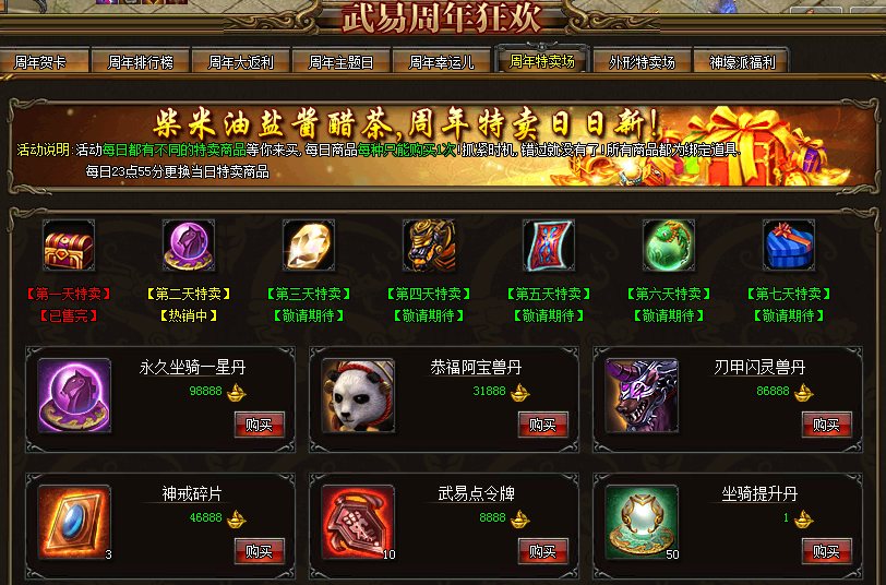 活动详情:活动期间每日都有不同的特卖商品等你来买,每日商品每种只能购买1次!所有商品均为绑定道具,每日23点55分会更换当日特卖商品。