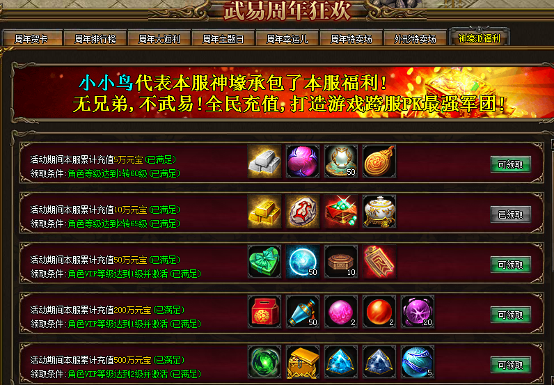 活动详情:周年返利分累计充值大奖和每日充值赠礼。每日充值达到一定元宝数后,可领取对应奖励,每日0点重置,次日可继续参与。活动期间累计充值达到一定数额还可领取额外大奖。