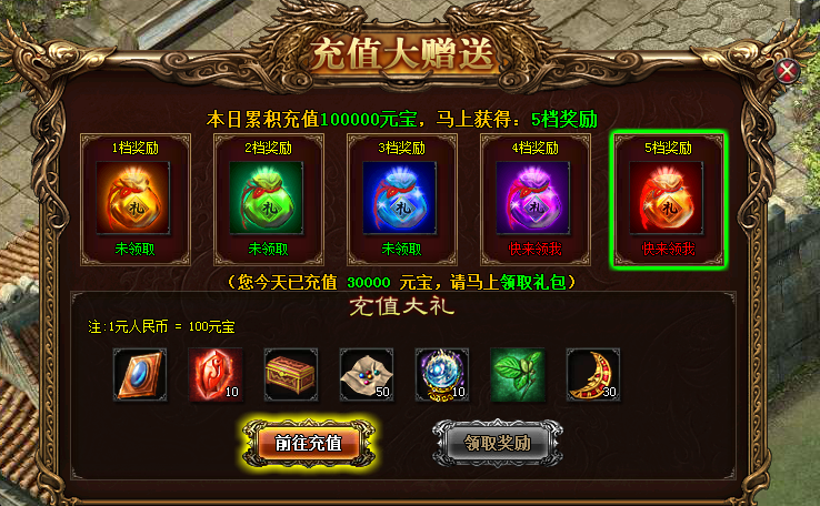 单天累积充值3000元宝或以上可获得1档奖励:坐骑提升丹*30、混沌灵液*10、转生灵魄令*1、超级金砖*1、超级银砖*1