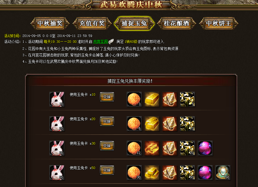 4、此活动满足1转60级玩家方能参与哦!所需中秋月饼可参与“中秋抽奖”、“捕捉玉兔”、“桂花酿酒”获得。
