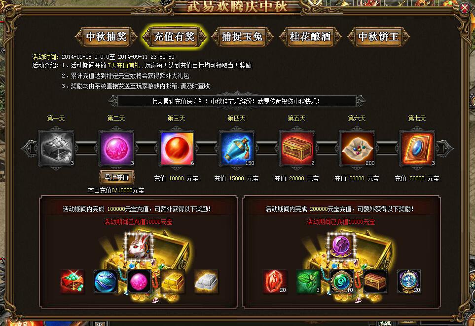 单天累积充值10000元宝或以上可获得2档奖励:坐骑提升丹*50、混沌灵液*20、极效修为丹*5、武魂经验丹中*5、黄金锄头*5