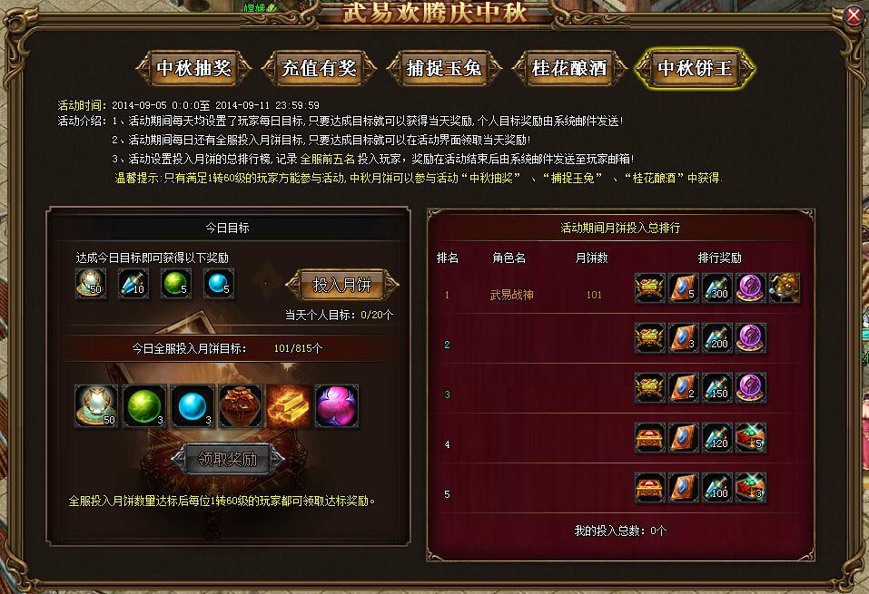 3、活动设置投入月饼的总排行榜,记录全服前五名投入玩家,奖励在活动结束后由系统邮件发送至玩家邮箱!