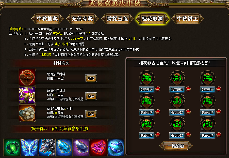 活动详情:活动开启时,满足1转60级的玩家即可获得2个朝露酒坛。投入桂花可开始酿酒。每次酿酒的时间为2小时,2小时后就可揭酒豪饮,有机会获得豪华奖励哦!使用“酒曲”可以减少1小时的酿酒时间。玩家可在活动界面购买酒坛,填满剩下的酒窖空位,还可使用“一键酿酒”功能立刻揭开所有在酿酒坛并获得全部奖励!