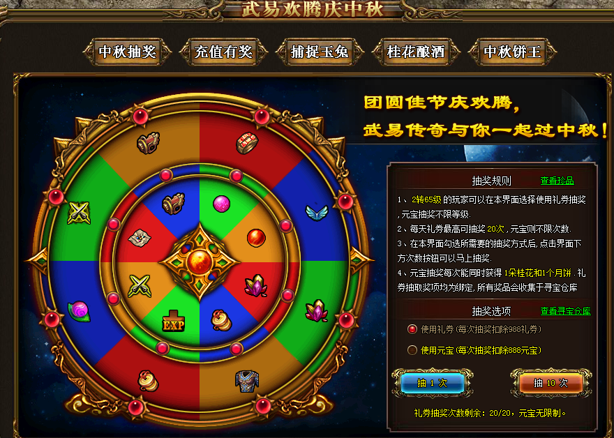 活动详情:活动期间,2转65级的玩家可以在本界面选择使用礼券抽奖,用元宝抽奖则不限等级。每天礼券最高可抽奖20次,元宝不限次数。每次元宝抽奖的同时,还能获得1个月饼和1朵桂花。礼券抽取奖项均为绑定,所有奖品会收集于寻宝仓库。