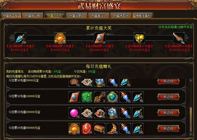 活动详情:活动期间,玩家累计充值达到指定元宝,可以获得对应等阶的奖励;每日充值达到指定元宝,也可以获得每日充值赠礼的道具。每天23点55分重置昨天的数据,两类奖励达标后自动邮件发送。