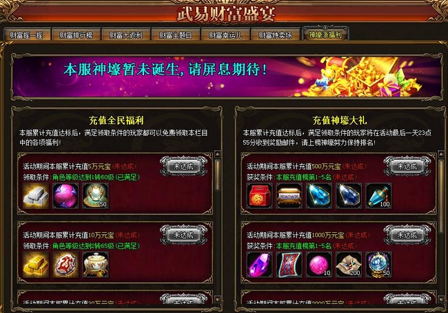 神豪充值全民领奖,只要本服神豪够给力,全民都有福利哦,屏住呼吸期待神豪的降临吧!