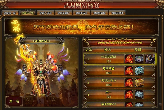 活动详情:活动期间,本平台全部服务器消费不低于100万元宝的玩家可上财富排行榜,上榜的前十名玩家可获得对应排名大奖,其余上榜玩家可获得达标奖励。