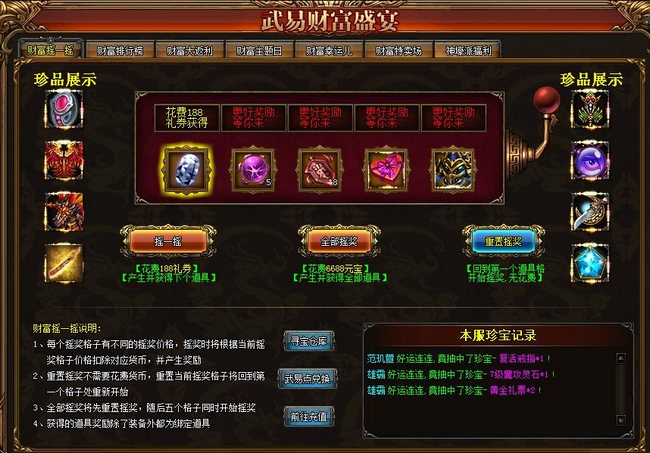 活动详情:财富摇一摇每个摇奖格子有不同的摇奖价格,玩家可以逐个格子进行摇奖,也可以一次性全部摇奖,摇奖时根据当前摇奖格子价格扣除相应货币,并产生奖励,获得的道具除装备外均为绑定道具。