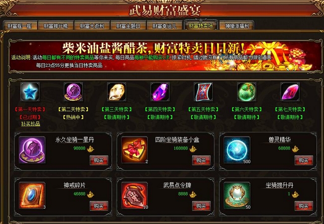 活动详情:活动期间每天会有6个特卖折扣道具,每个特卖物品只可购买1次,抓紧时机,不要错过哦!已经过期的特卖,还可使用补买珍品功能补买当日的特卖物品,当日已经购买过的不能再补买。