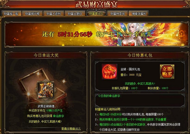 活动详情:活动期间,每天本服会有限量出售的100个特惠礼包,玩家购买特惠礼包可以获得一个1-100的幸运数字,每个幸运数字都不会重复。每天21点整,会抽出本服的中奖数字,拥有这个中奖数字的玩家,可以获得今日的幸运大奖!