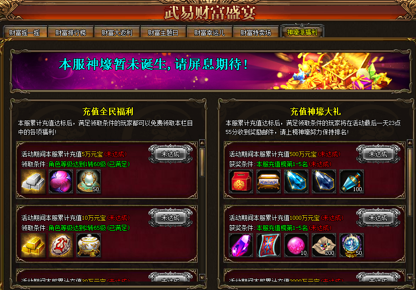 神豪充值全民领奖,只要本服神豪够给力,全民都有福利哦,屏住呼吸期待神豪的降临吧!