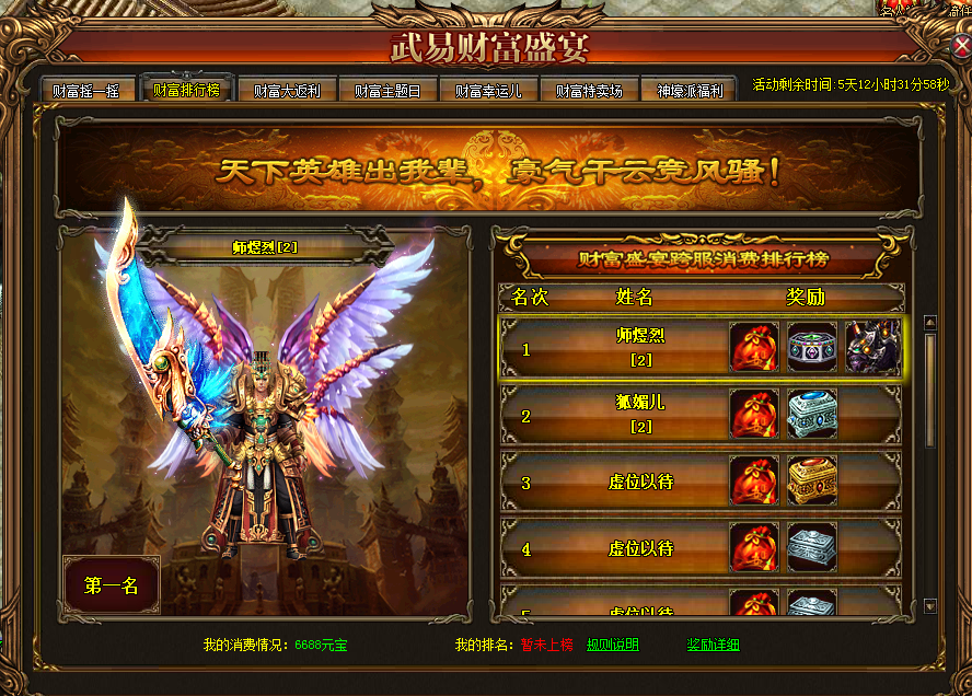 活动详情:活动期间,本平台全部服务器消费不低于100万元宝的玩家可上财富排行榜,上榜的前十名玩家可获得对应排名大奖,其余上榜玩家可获得达标奖励。