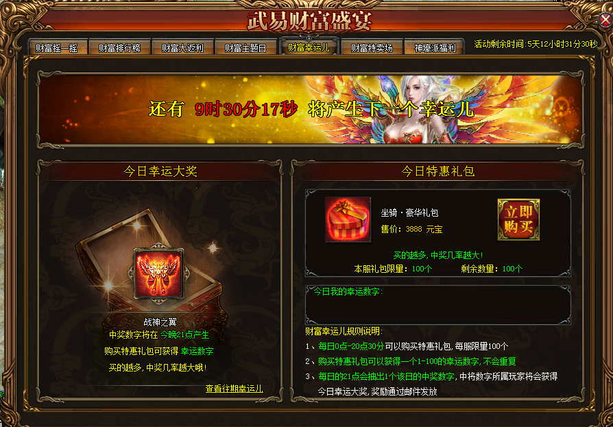 活动详情:活动期间,每天本服会有限量出售的100个特惠礼包,玩家购买特惠礼包可以获得一个1-100的幸运数字,每个幸运数字都不会重复。每天21点整,会抽出本服的中奖数字,拥有这个中奖数字的玩家,可以获得今日的幸运大奖!