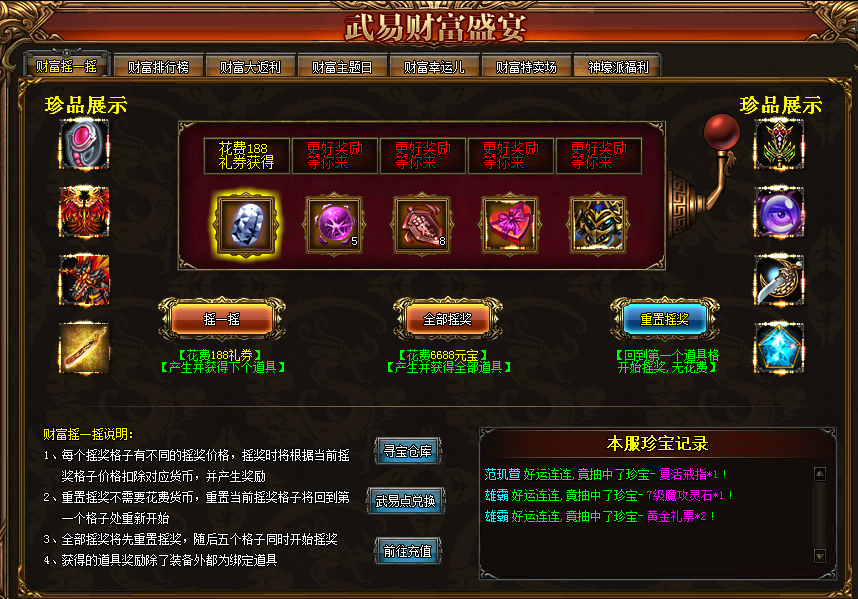 活动详情:财富摇一摇每个摇奖格子有不同的摇奖价格,玩家可以逐个格子进行摇奖,也可以一次性全部摇奖,摇奖时根据当前摇奖格子价格扣除相应货币,并产生奖励,获得的道具除装备外均为绑定道具。