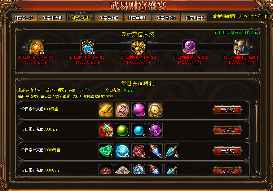 活动详情:活动期间,玩家累计充值达到指定元宝,可以获得对应等阶的奖励;每日充值达到指定元宝,也可以获得每日充值赠礼的道具。每天23点55分重置昨天的数据,两类奖励达标后自动邮件发送。