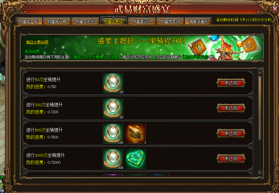活动详情:活动期间,每天对应一个主题提升日,每个主题日有各种提升目标,达到目标指定值后,奖励通过邮件直接发送。