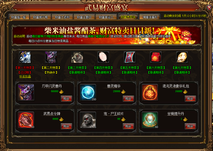活动详情:活动期间每天会有6个特卖折扣道具,每个特卖物品只可购买1次,抓紧时机,不要错过哦!已经过期的特卖,还可使用补买珍品功能补买当日的特卖物品,当日已经购买过的不能再补买。