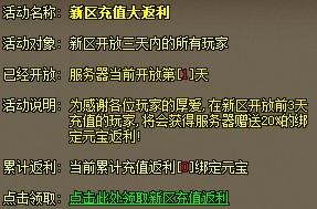 【活动内容】为感谢各位玩家的厚爱,在新区开放前3天充值的玩家,将会获得服务器赠送20%的绑定元宝返利。