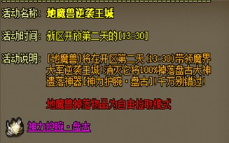 【活动内容】地魔兽将在开区第二天(13:00)带领魔界大军逆袭王城!消灭他将100%掉落盘古大神遗落的神器【神威护腕·盘古】千万别错过!