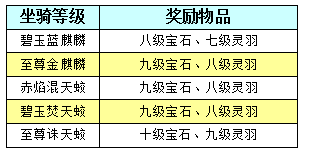 活动内容:自古英雄,战无不胜,麒麟神兽,蛟龙横扫。.活动期间,坐骑升阶到对应等级可以获取豪礼: